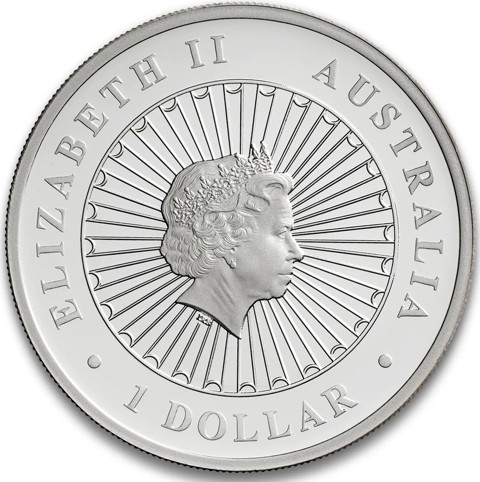 Fourth crowned portrait of HM Queen Elizabeth II facing right, wearing the Girls of Great Britain and Ireland tiara, highlighted by a radiant sunburst background surrounded by the inscriptions “ELIZABETH II,” “AUSTRALIA, 2015,” and the face value “1 DOLLAR.”