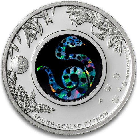 The reverse features a central opal inlay, where the shimmering gemstone has been laser-cut to depict a detailed a Rough-Scaled Python, radiating with iridescent flashes of blue, green, and fiery hues. Around the opal are finely engraved the Southern Cross constellation a renowned star group which is only visible in the Southern hemisphere, a collection of fern fronds, a quarter moon, reflecting the animal’s nocturnal nature The inscriptions include "ROUGH-SCALED PYTHON," alongside the Perth Mint’s “P” mintmark and the the designer's initials (AH) at the opposite on the fern below the moon. The metal, weight and purity marks “1oz 999 SILVER,” date "2015" at the right side.