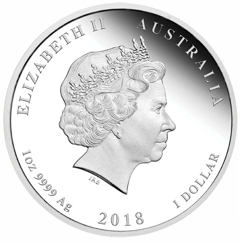 Fourth crowned portrait of HM Queen Elizabeth II facing right, wearing the Girls of Great Britain and Ireland tiara. framed by inscriptions “ELIZABETH II,” “AUSTRALIA,” the denomination “1 DOLLAR,” the year 2018, and silver purity and weight.
