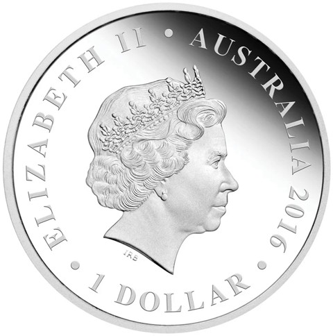 Fourth crowned portrait of HM Queen Elizabeth II facing right, wearing the Girls of Great Britain and Ireland tiara. surrounded by the inscriptions “ELIZABETH II,” “AUSTRALIA, 2016,” and the face value “1 DOLLAR.”