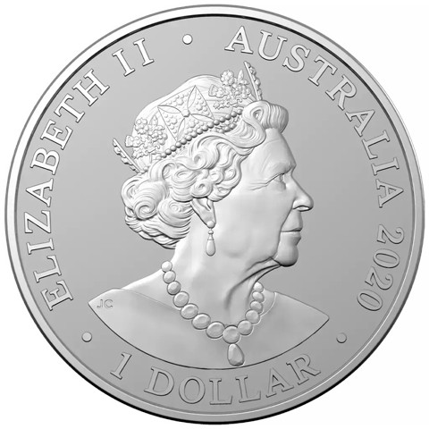 6th crowned portrait of HM Queen Elizabeth II facing right (the Commonwealth effigy), wearing the George IV State Diadem, the Coronation Necklace and Earrings framed by inscriptions ELIZABETH II, AUSTRALIA, the coin's mintage year, "2020" and the face value “1 DOLLAR” below.