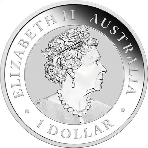 6th crowned portrait of HM Queen Elizabeth II facing right (the Commonwealth effigy), wearing the George IV State Diadem, the Coronation Necklace and Earrings framed by inscriptions “ELIZABETH II,” “AUSTRALIA,” and the face value “1 DOLLAR.”