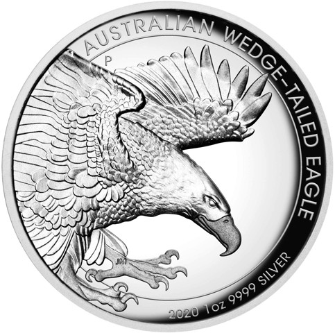 The coin pays tribute to Australia’s largest bird of prey by depicting a close-up representation of a swooping wedge-tailed eagle with its talons outstretched ready to strike. The inscriptions read "AUSTRALIAN WEDGE-TAILED EAGLE" around above right, "2020 – 1 oz 9999 SILVER" found around below denotes the year, weight, content, and purity, with the Perth Mint “P” mintmark completing the design at the left side and the designer's initials (JM) appears discreetly in the eagle's left leg.
