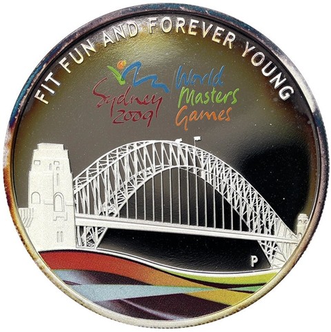 The reverse of the silver proof depicts Sydney’s iconic Harbor Bridge and a colorful representation of water underneath the bridge with a World Masters Games colored logo above it. The games motto, "FIT FUN AND FOREVER YOUN" around above and the Perth Mint’s mintmark below right the bridge.