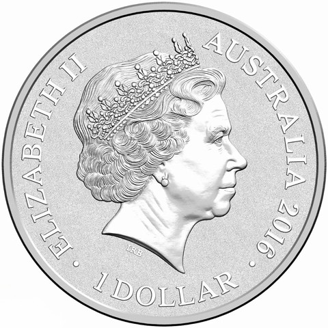 Fourth crowned portrait of HM Queen Elizabeth II facing right, wearing the Girls of Great Britain and Ireland tiara. surrounded by the inscriptions “ELIZABETH II,” “AUSTRALIA,2016,” and the face value “1 DOLLAR.”