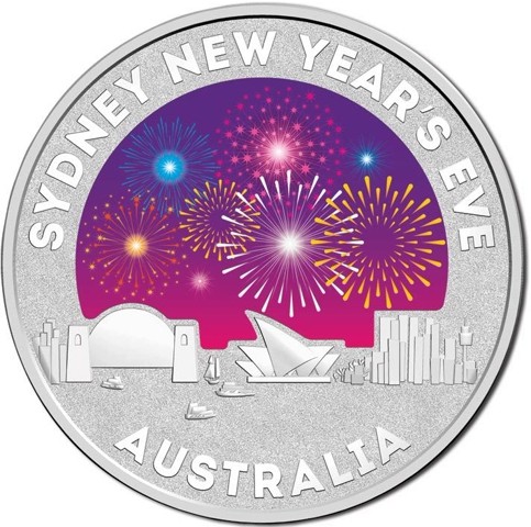 This coin captures the features an outline of iconic Australian landmarks the Harbor Bridge, Opera House and city skyline with a stunning colored view of fireworks, the event showcased themes of light, love, and celebration, that are held in Sydney on New Year's Eve. The inscription "SYDNEY NEW YEAR'S EVE" around above and country name around below.