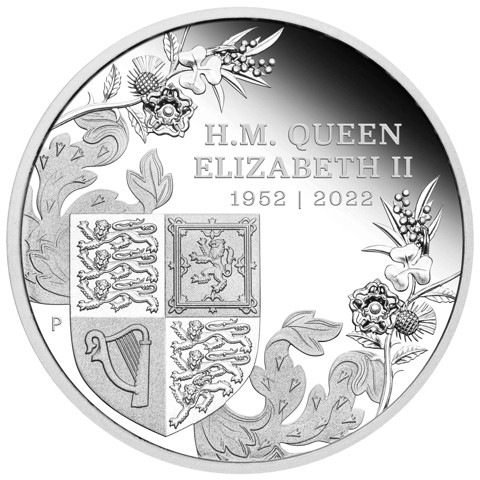 The coin depicts the Shield of the Royal Coat of Arms and a figurative flower stem combining an English rose, Irish shamrock and Scottish thistle, together with Australian wattle - national floral emblem. Included in the design is the inscription ‘H.M. QUEEN ELIZABETH 1952 | 2022’, The Perth Mint’s ‘P’ mintmark, and an artistic interpretation of the mantle from the Royal Arms - originally a linen cover on the back of a medieval knight's helmet.
