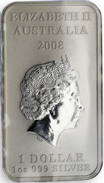 Fourth crowned portrait of HM Queen Elizabeth II facing right, wearing the Girls of Great Britain and Ireland tiara. surrounded by the inscriptions “ELIZABETH II,” the country name "AUSTRALIA", the year "2008" the denomination ONE DOLLAR, and the metal, purity and weight "1oz 999 Silver" below.