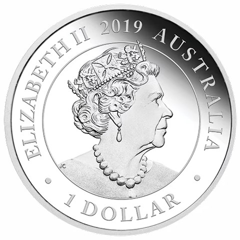 6th crowned portrait of HM Queen Elizabeth II facing right (the Commonwealth effigy), wearing the George IV State Diadem, the Coronation Necklace and Earrings framed by inscriptions “ELIZABETH II,” “AUSTRALIA,2019,” and the face value “1 DOLLAR.”