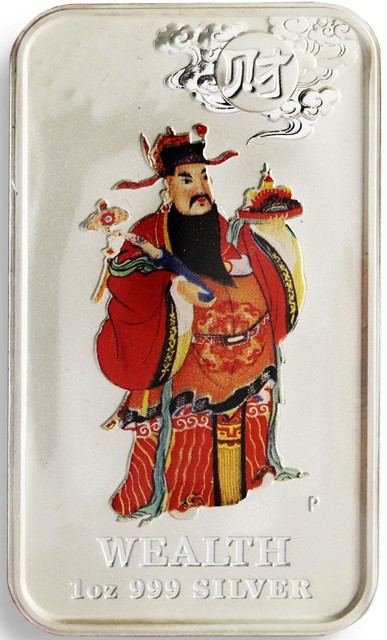 The reverse presents a richly colored image of the God of Wealth (Caishen), depicted in traditional red robes with gold ornaments, holding a scroll and treasures as symbols of material abundance. Above him, in stylized clouds, appears the Chinese character (財) for “Wealth,” while below the inscription WEALTH highlights the theme.
