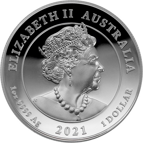 6th crowned portrait of HM Queen Elizabeth II facing right (the Commonwealth effigy), wearing the George IV State Diadem, the Coronation Necklace and Earrings framed by inscriptions “ELIZABETH II,” “AUSTRALIA,” above, weight, purity, and metal content "1oz 9999 Ag" and 1 DOLLAR, and the coin's mintage year, "2021" below.