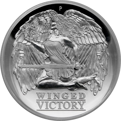 The reverse depicts an Art Deco style interpretation of Nike. Her muscular figure, as a symbol of strength, is seen kneeling as she honors an unseen hero with a victory laurel in the palm of her right hand. She holds a sword in a non-threatening position low on her left side as a gesture of respect and a sign of peace. Also included in the design are the inscription "WINGED VICTORY" and the traditional mintmark "P" of the Perth Mint above and the designer's initials (JM) in tiny letters in the lowest part of the left wing.