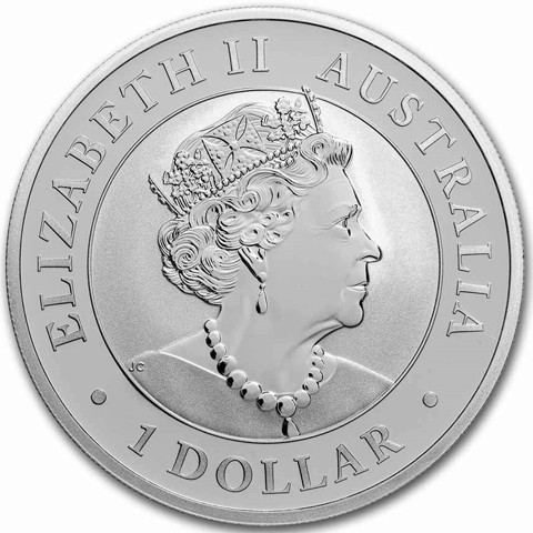 6th crowned portrait of HM Queen Elizabeth II facing right (the Commonwealth effigy), wearing the George IV State Diadem, the Coronation Necklace and Earrings framed by inscriptions “ELIZABETH II,” “AUSTRALIA,” and the face value “1 DOLLAR.”