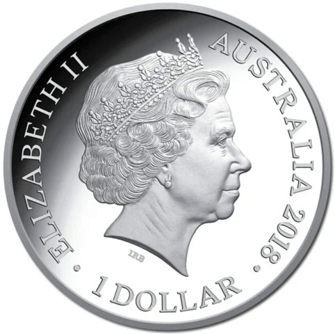 Fourth crowned portrait of HM Queen Elizabeth II facing right, wearing the Girls of Great Britain and Ireland tiara within a circle surrounded by the inscriptions “ELIZABETH II,” “AUSTRALIA, 2018,” and the face value “1 DOLLAR.”