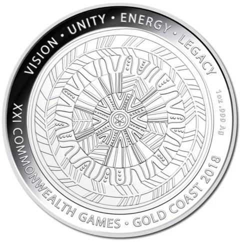 The reverse design forms part of the GC2018 Reconciliation Action Plan and includes stunning Aboriginal artwork surrounded by the spirit of the Games and the spirit of Reconciliation "VISION • UNITY • ENERGY • LEGACY" around above and inscription identify theme accompanied date "XXI COMMONWEALTH GAMES • GOLD COAST 2018" around below. The coin’s metal, weight and purity"1oz .999 Ag" is inscribed at the right side.