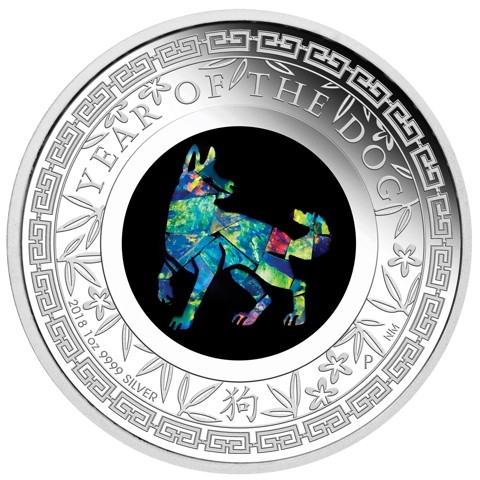 The reverse features a central opal inlay, where the shimmering gemstone has been laser-cut to depict a dog, radiating with iridescent flashes of blue, green, and fiery hues. Around the opal are finely engraved a collection of stylized leaves and flowers. The inscriptions include YEAR OF THE DOG, alongside the Perth Mint’s “P” mintmark and the the designer's initials (NM) next to it. The metal, weight and purity marks “1oz 999 SILVER,” date "2018" at the right side. The Chinese character (狗) for 'rooster' below.