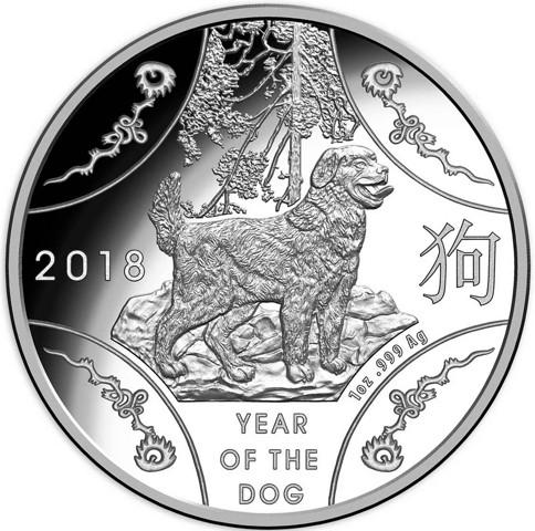 On the reverse, the design presents a beautifully detailed design of a dog stands alert with its head raised and mouth slightly open with its tongue extended, conveying confidence and guardianship standing on rocky terrain below a leafy tree. Around the central figure incorporates Chrissy Lau’s traditional Chinese design decorative panels containing floral ornaments. The inscriptions include “2018” above and in three lines “YEAR OF THE DOG" below. At the right, the Chinese character (狗) for “Dog.” To the right, the metal, purity and weight "1oz .999 Ag .”