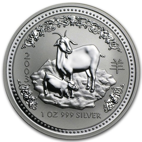 On the reverse, the design depicts a graceful adult goat with a young kid standing beside it, both shown in a natural rocky landscape. Ornamental scrolls frame the scene, while the year “2003” appears on the left, the Chinese character (羊) for “Goat” on the right, and the inscription “1 OZ 999 SILVER” below and the Perth Mint's mark, "P," is not included.