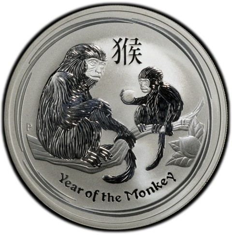 The reverse of the coin depicts an adult monkey and a baby monkey sitting in a peach tree. The baby is holding a peach, which is symbolic of longevity and immortality. The Chinese character (猴) for 'monkey' above and the inscription 'Year of the Monkey' also in the design inscribed close to the bottom rim. In the left field, The Perth Mint’s traditional ‘P’ Mint Mark appears and the the designer's initials (IJ) at the opposite on a branch behind the baby.