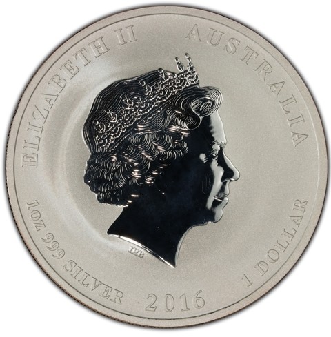Fourth crowned portrait of HM Queen Elizabeth II facing right, wearing the Girls of Great Britain and Ireland tiara. surrounded by the inscriptions “ELIZABETH II, AUSTRALIA, face value "1 DOLLAR" – date "2016," metal, purity and weight "1oz 999 SILVER.”