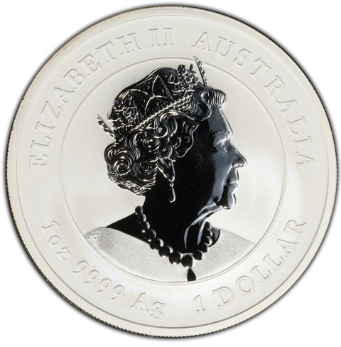 6th crowned portrait of HM Queen Elizabeth II facing right (the Commonwealth effigy), wearing the George IV State Diadem, the Coronation Necklace and Earrings framed by inscriptions “ELIZABETH II,” “AUSTRALIA,” above, weight, purity, and metal content "1oz 9999 Ag" and the face value “1 DOLLAR.”