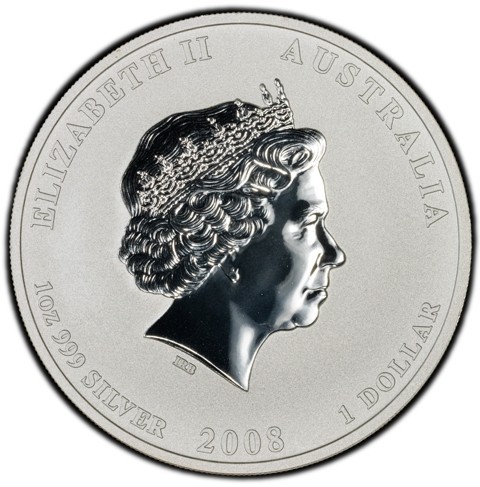 Fourth crowned portrait of HM Queen Elizabeth II facing right, wearing the Girls of Great Britain and Ireland tiara. surrounded by the inscriptions “ELIZABETH II, AUSTRALIA, face value "1 DOLLAR" – date "2008," metal, purity and weight "1oz 999 SILVER.”