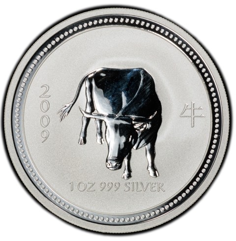 The reverse features a strong ox walking toward the viewer inside the coin’s dotted rim. The year 2009 is marked on the left and the Chinese character (牛) for “ox” is on the right. Below, the words “1 OZ 999 SILVER” mark the coin’s true value. The Perth Mint’s “P” mintmark is not included.