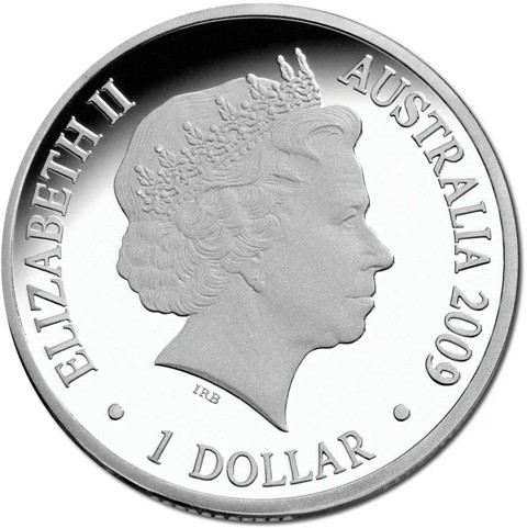 Fourth crowned portrait of HM Queen Elizabeth II facing right, wearing the Girls of Great Britain and Ireland tiara. surrounded by the inscriptions “ELIZABETH II,” “AUSTRALIA,2009,” and the face value “1 DOLLAR.”