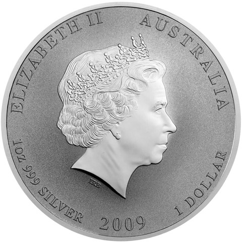 Fourth crowned portrait of HM Queen Elizabeth II facing right, wearing the Girls of Great Britain and Ireland tiara. surrounded by the inscriptions “ELIZABETH II, AUSTRALIA, face value "1 DOLLAR" – date "2008," metal, purity and weight "1oz 999 SILVER.”