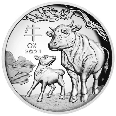 the coin’s reverse portrays a charming image of an ox and its calf walking across fields with a cherry blossom tree, a symbol of love and beauty. The Chinese character (牛) for ox is included above on this side along with the “P” mint mark of Perth at the right side and the designer's initials (IJ) are on an ox's right hoof.