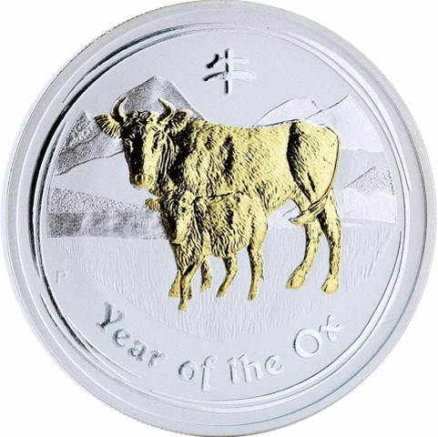 The reverse design portrays a gilded ox with its calf, set against a background of stylized mountains and grassland. Above the animals is the Chinese character (牛) for Ox, while the inscription “Year of the Ox” is placed below, emphasizing the theme. The gilded details add depth and elegance, highlighting the noble features of the animals. In the left field, The Perth Mint “P” mintmark appears.