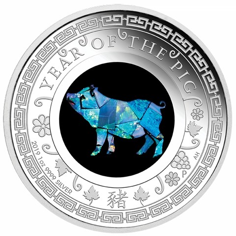 The reverse features a central opal inlay, where the shimmering gemstone has been laser-cut to depict a pig , radiating with iridescent flashes of blue, green, and fiery hues. Around the opal are finely engraved a collection of stylized leaves and flowers. The inscriptions include YEAR OF THE PIG, alongside the Perth Mint’s “P” mintmark and the the designer's initials (AH) next to it. The metal, weight and purity marks “1oz 999 SILVER,” date "2019" below left. The Chinese character (豬) for 'pig' below.