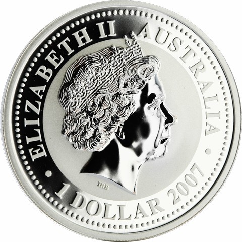 Fourth crowned portrait of HM Queen Elizabeth II facing right, wearing the Girls of Great Britain and Ireland tiara. surrounded by the inscriptions “ELIZABETH II,” “AUSTRALIA, 2007,” and the face value “1 DOLLAR.”