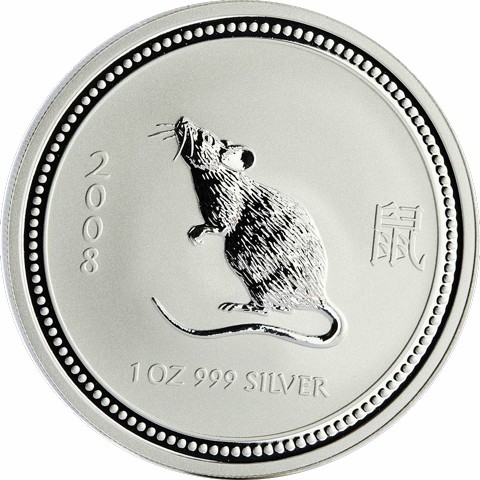 The reverse presents a delicate design of a mouse sitting upright on its hind legs, its long tail curling gracefully along the ground as it looks upward. The image is framed by ornamental patterns, with inscriptions 2008, the Chinese character (鼠) for Mouse, and 1 oz 999 Silver, confirming the weight and purity. The Perth Mint’s “P” mintmark is not included.
