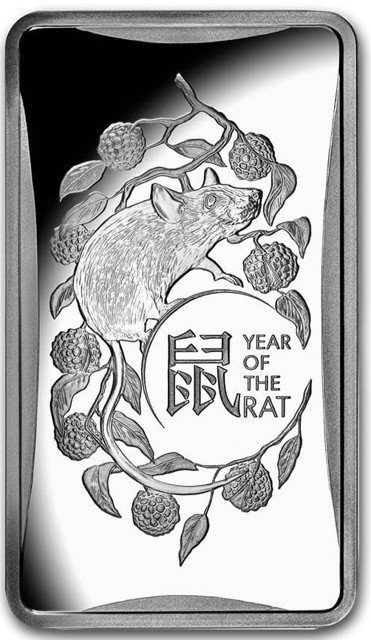 The reverse of the coin features the detailed image of a clever rat stands on a crescent moon shape with a six auspicious branch behind it. On the left, the inscriptions: "豬" - Rat in Chinese character and "1oz .999 Ag" - the weight of the coin and the fineness of the Silver. On the bottom, the inscription: "YEAR OF THE RAT" - the name of the coin.
