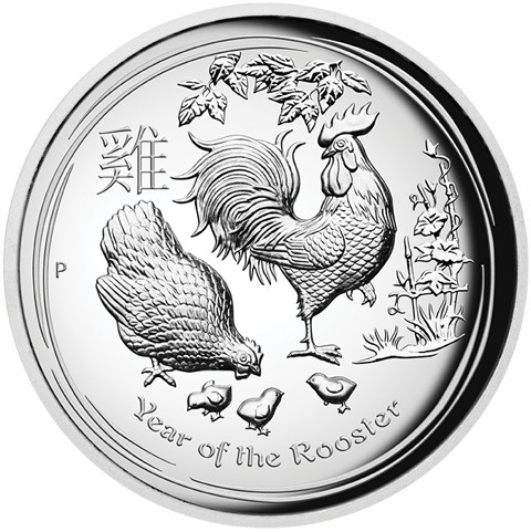 The reverse features a tall rooster standing among the bamboo foliage and flowers as a hen and three chicks peck for food on the ground nearby. This beautiful lunar design also incorporates the Chinese character (雞) for "Rooster", the inscription "Year of the Rooster" is inscribed close to the bottom rim. In the left field, The Perth Mint's traditional "P" mint mark.