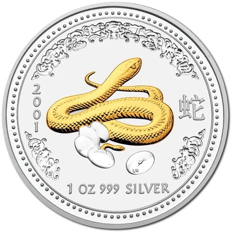 The reverse feature a gilded in 24-carat gold snake coiled near five eggs, one of them hatching and a small snake coming out of it. On the front-most egg, within a beaded border, surrounded by floral motifs, the designer's initials LK. Vertically on the left, the year 2001. On the right, the Chinese character ( 蛇) for "snake". Horizontally below, the coin's weight, and purity are also inscribed below “1 OZ 999 SILVER.” and the Perth Mint's mark, "P," is included.