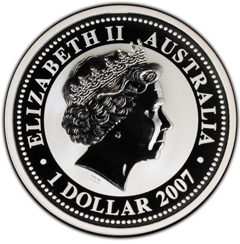 Fourth crowned portrait of HM Queen Elizabeth II facing right, wearing the Girls of Great Britain and Ireland tiara. surrounded by the inscriptions “ELIZABETH II,” “AUSTRALIA, 2007,” and the face value “1 DOLLAR.”