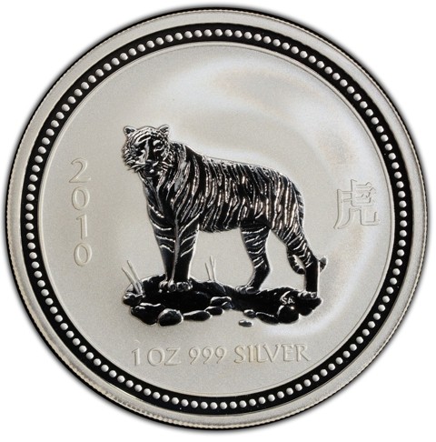 The reverse depicts a finely detailed tiger standing on rugged rocks, its muscular body and expressive stripes rendered with lifelike precision. Inscriptions include “2010,” the Chinese character (虎) for Tiger, and “1 oz 999 Silver,” with a beaded border completing the design. The Perth Mint’s “P” mintmark is not included.