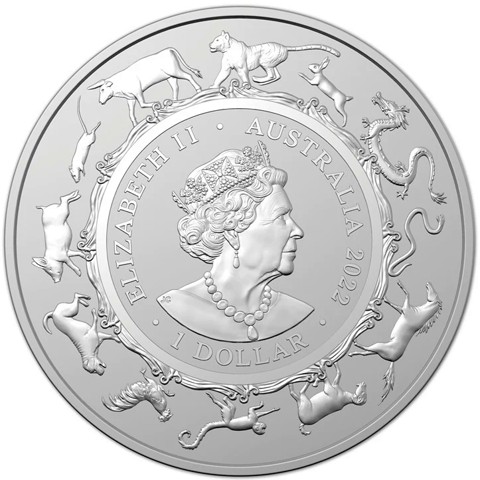 6th crowned portrait of HM Queen Elizabeth II facing right (the Commonwealth effigy), wearing the George IV State Diadem, the Coronation Necklace and Earrings framed by inscriptions “ELIZABETH II,” “AUSTRALIA, 2022,” and the face value “1 DOLLAR” surrounded by a lunar calendar wheel, will notice that each of the 12 animals in the cycle is represented in the design of the wheel. At the very top of the wheel, indicating it is the animal represented for the year, is the ox.