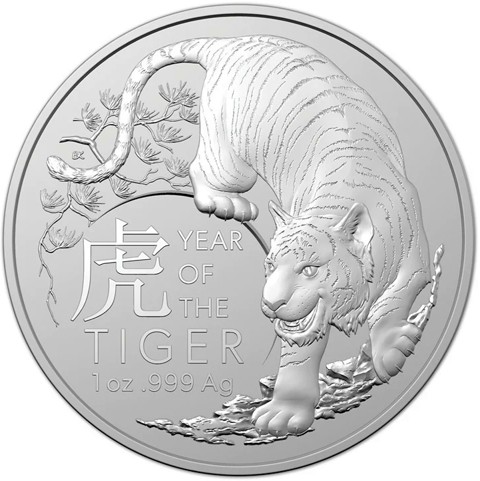 The reverse of the coin features the image of a finely detailed majestic tiger walking on rugged rocks, its muscular body and expressive stripes fur rendered with lifelike precision and its mouth open, exposing its many teeth and powerful jaws ready to clamp down on prey with pine branches behind, enclosing a crescent-shaped. On the left, the inscriptions: "虎" - Tiger in Chinese character. On the bottom, the inscription: "YEAR OF THE TIGER" - the name of the coin and the purity of the material "1oz .999 Ag." The designer's initials (BK) are above left.