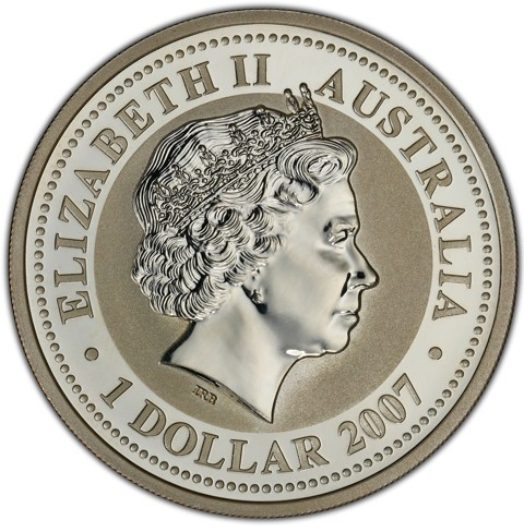 Fourth crowned portrait of HM Queen Elizabeth II facing right, wearing the Girls of Great Britain and Ireland tiara. surrounded by the inscriptions “ELIZABETH II,” “AUSTRALIA, 2007,” and the face value “1 DOLLAR.”