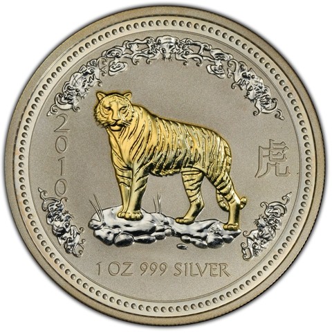 The reverse displays a magnificent gilded tiger standing proudly on rocky terrain. The animal’s golden finish contrasts strikingly with the frosted silver background, enhancing the intricate details of its stripes and muscular body. Surrounding the central image are ornate floral patterns, the year inscription “2010,” the Chinese character for “Tiger,” and “1 OZ 999 SILVER.” The Perth Mint’s “P” mintmark is not included.