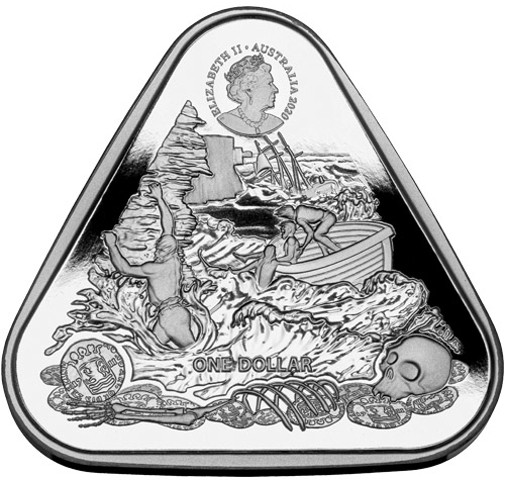 The unique, triangular-shaped coin obverse features 6th crowned portrait of HM Queen Elizabeth II facing right (the Commonwealth effigy), wearing the George IV State Diadem, the Coronation Necklace and Earrings framed by inscriptions “ELIZABETH II,” “AUSTRALIA,” and the coin's mintage year, "2020" at the top point of the triangular coin’s shape, with three scenes which show the dramatic story of the Zuytdorp in its its final capsized state shortly after it was wrecked in 17212 whilst in the middle it shows survivors struggle to come ashore along a rocky coastline in a smaller lifeboat with skeleton and below which strewn on the ground Dutch coins dated 1711.at the bottom in the foreground . The face value “1 DOLLAR” below.