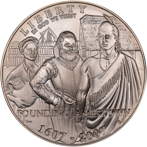 The obverse design of the $1 silver coin, depicts three faces of diversity, representing the cultures that lived and worked together to ensure the success of the colony at Jamestown. The inscriptions are "Liberty," "In God We Trust," "Founding Jamestown," and "1607–2007."
