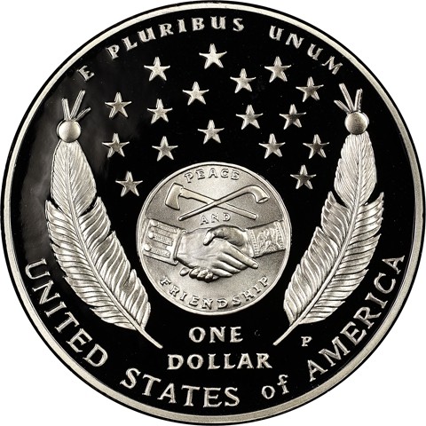 The reverse features two feathers to represent the many American Indian cultures touched by the Corps of Discovery. It also features an image of the original Jefferson Peace Medal presented to American Indian nations during the expedition on behalf of President Jefferson, surrounded by 17 stars representing the number of states in the Union in 1804.