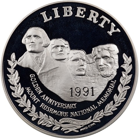 The obverse design of the silver dollar contains a view of Mount Rushmore. The mountainside carving by Gutzon Borglum features busts of Presidents George Washington, Thomas Jefferson, Theodore Roosevelt, and Abraham Lincoln. At the bottom of the coin are two laurel wreaths with a ribbon containing the motto “In God We Trust”. Other inscriptions include “Liberty”, “Golden Anniversary”, “Mount Rushmore National Memorial”, and “1991”.