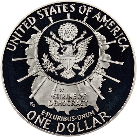 On the reverse of the coin is the Great Seal of the United States with a sunburst and an outline of the America. There is a star placed at the location of Mount Rushmore with an inscription “Shrine of Democracy”. The remaining inscriptions include “United States of America”, “E Pluribus Unum”, and “One Dollar”.