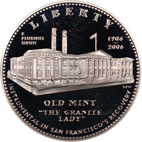 The obverse design of the silver dollar is a rendition of the San Francisco Old Mint, originally prepared for the San Francisco Mint Medal by Sherl J. Winter.