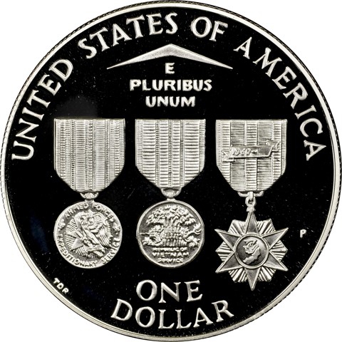 The reverse design features three military ribbons, Left: Armed Forces Expeditionary Medal, Middle: Vietnam Service Medal and Right: Vietnam Campaign Medal. The coin inscriptions include “United States of America”, “E Pluribus Unum”, and the denomination “One Dollar”.